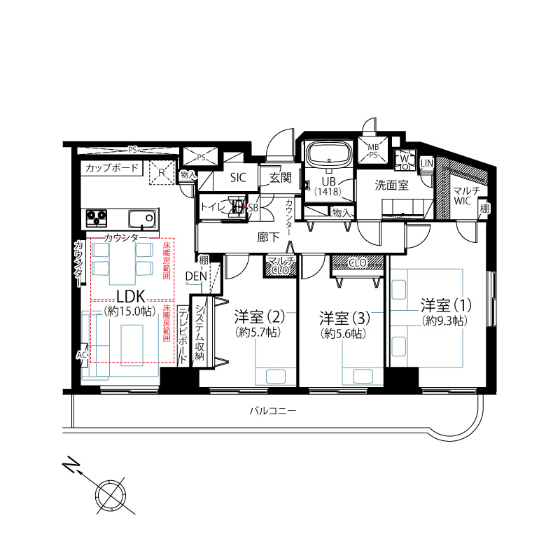 約12.15mのワイドスパンバルコニー(全室バルコニーに面しています)
