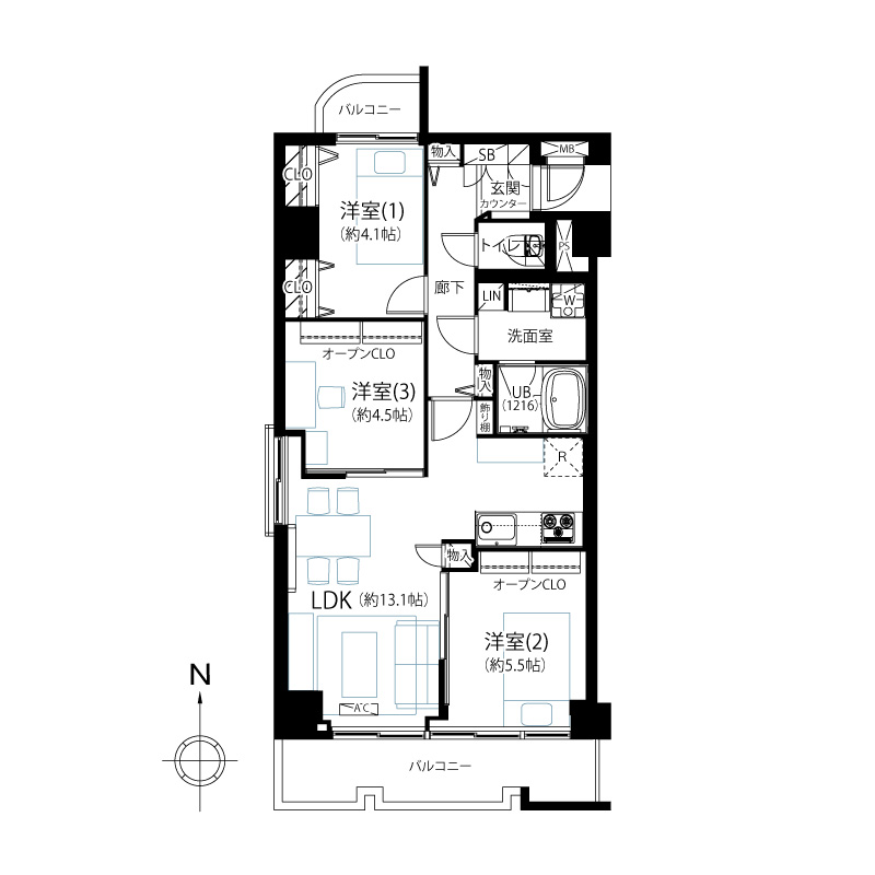 三方角部屋・両面バルコニー住戸につき日当り・通風良好